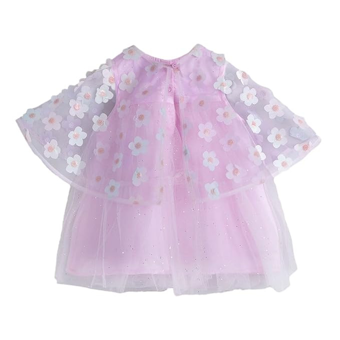 Material: 100% Cotton Package Includes: 1 Party Dress, 1 Cape Product feature: Floral applique, A-line, floral-embroidered cape and sparkly details Dimensions:- Party Dresses: Length: 96 cm , Chest: 56 cm The actual product may differ slightly in color from the one illustrated in the images.
