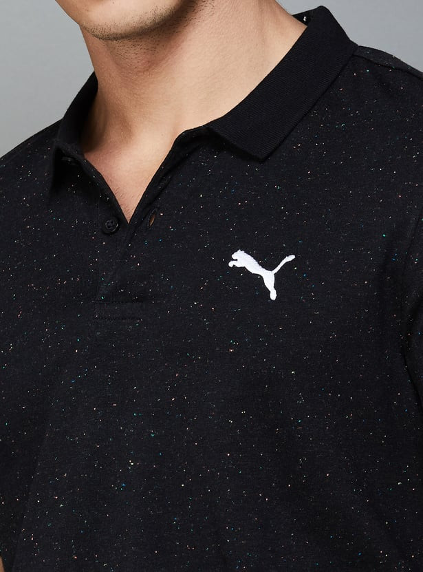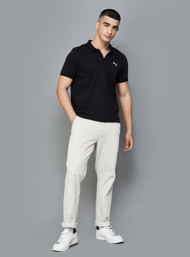 Take your off-duty style to new heights with this T-shirt. The embroidered detailing adds to the style. This tee has a polo collar, half sleeves, and a logo at the chest.