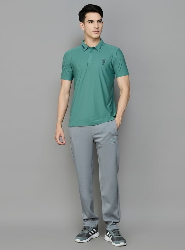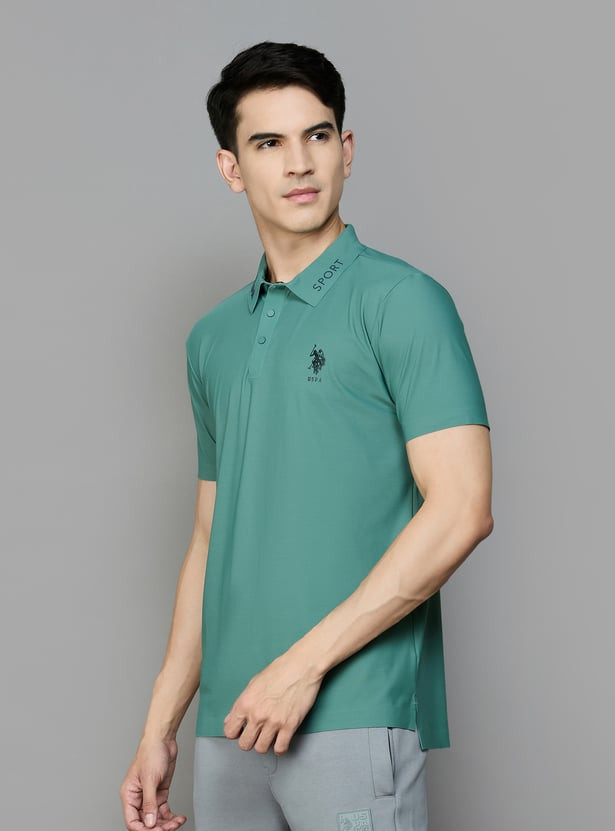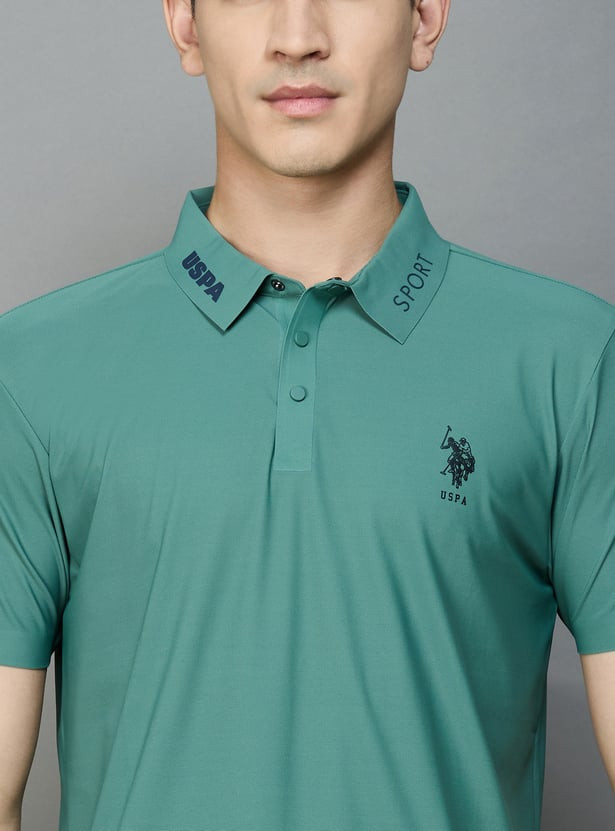 Look suave and stylish in this solid active polo T-shirt, complemented by a minimalistic logo detail on the chest, a logo-printed polo collar, half sleeves, a short button placket and a vented hem in a slim silhouette.