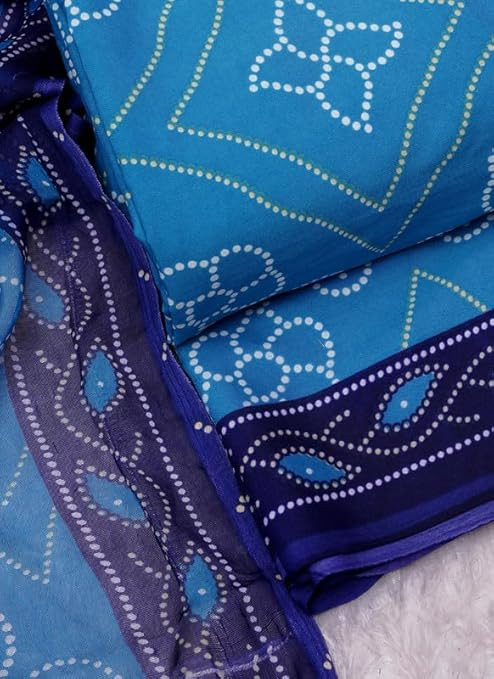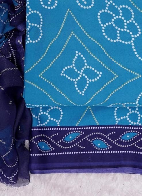 ||Material:-Crepe||Pattern:Bandhani||Color:- Sky Blue|| Top:- Crepe, Bottom:- Crepe, Dupatta:- Chiffon Enhance your wardrobe collection by adding this unstitched salwar suit dress material with dupatta.||Occasion-Party||Wedding|| Traditional Wear|| Daily|| Evening|| Office Wear||Festival Wear|| Unique features: Beautiful Winter & Summer collection, Fine quality winter &Summer wear Salwar Suit fabric for women/Girls.Step out in style by wearing this unstitched salwar suit dress material with dupatta. The images shown are for representational purposes only. Please note that the color of the product may slightly vary in comparison to the picture shown on the website due to various reasons which may include different lighting and devices during photo-shoot and also the color settings and resolution of your own monitor screen.