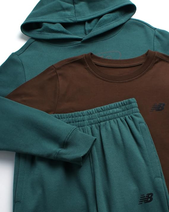 VERSATILE DESIGN: Designed for maximum comfort and flexibility, this New Balance 3-piece set allows your boy to mix and match with his existing wardrobe. The hoodie and jogger pants provide a relaxed yet stylish fit, perfect for layering during colder months. The t-shirt features a bold New Balance graphic, making it a versatile option that pairs well with jeans, shorts, or the included joggers.