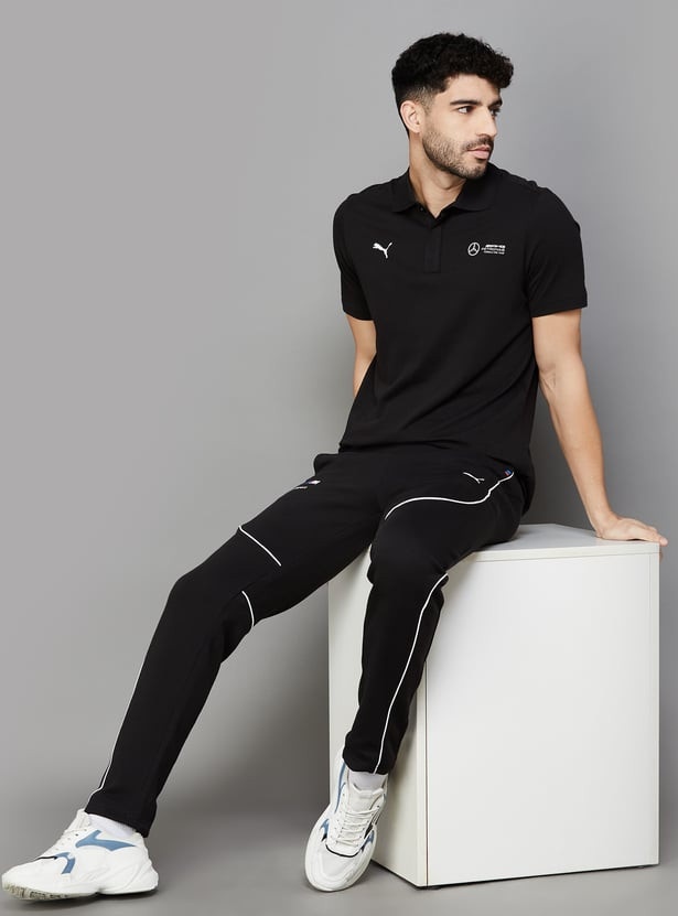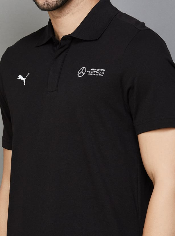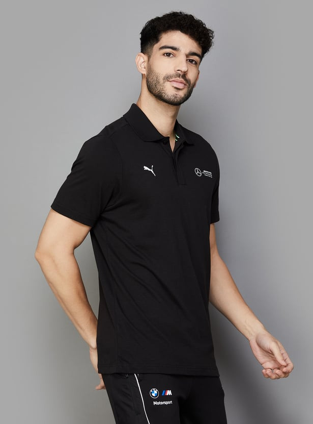 Elevate your style with this regular-fit polo t-shirt, crafted from single jersey fabric for comfort and durability. Featuring a classic polo collar with a button placket and short sleeves, it offers a timeless look. The Mercedes-AMG Petronas F1 logo and PUMA Cat on the chest add a touch of sporty sophistication.