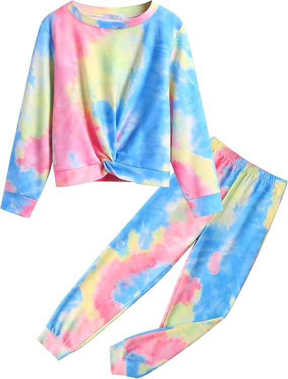Size:Two-Piece Tie dye clothes sets/Long sleeve pullover sweatshirts /Girl sports suit/Outfits for Girls/Girls twist front sweatshirt/Girls lounge set/Girls athletic tracksuits with pockets/Girls sweatsuit sets /2 Piece tracksuit set/Lounge wear Set/Jogger set/Casual for 5-12 years girls.Please carefully check the SIZE CHART