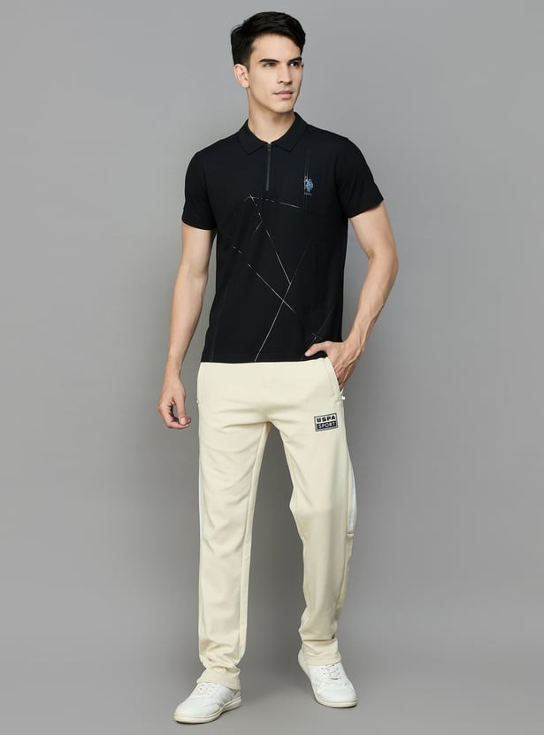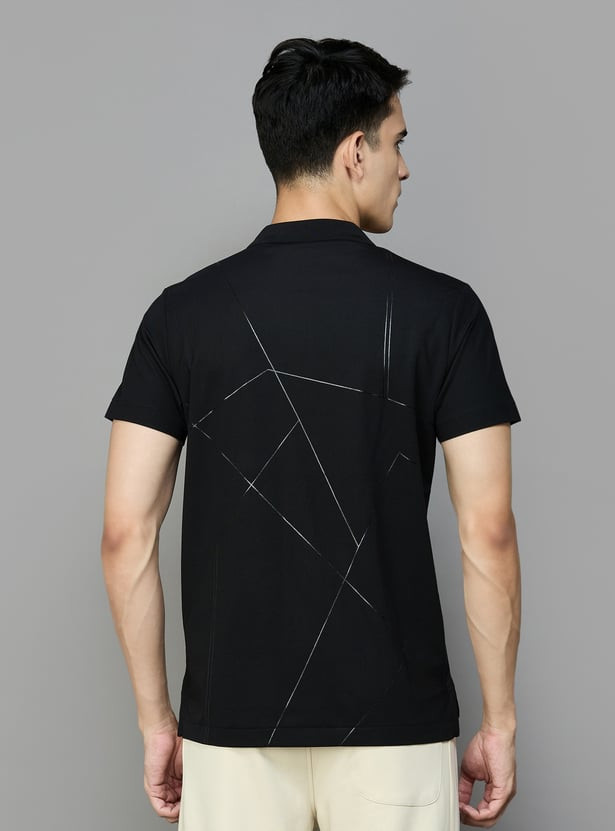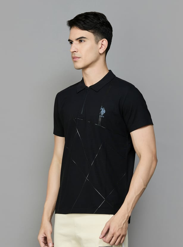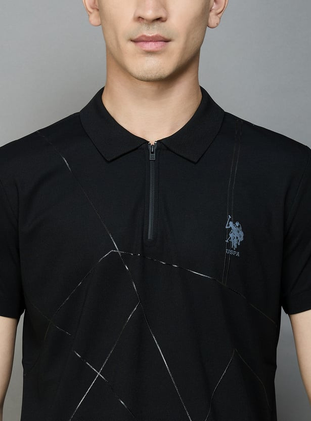 Look suave and stylish in this printed active polo T-shirt, complemented by a minimalistic logo detail on the chest, a classic polo collar, half sleeves, a short zip placket and a vented hem in a slim silhouette.