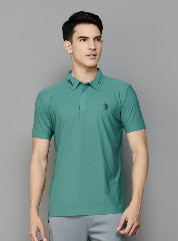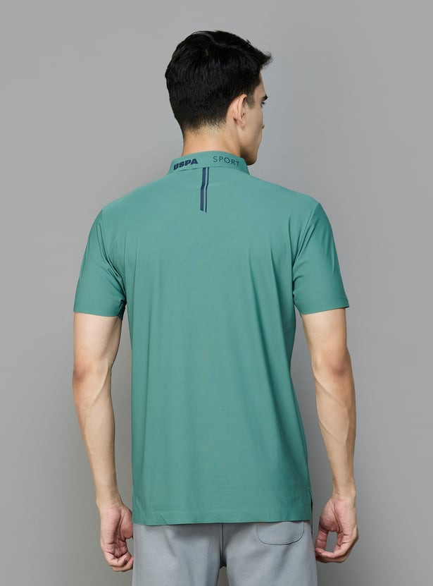 Look suave and stylish in this solid active polo T-shirt, complemented by a minimalistic logo detail on the chest, a logo-printed polo collar, half sleeves, a short button placket and a vented hem in a slim silhouette.