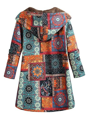 Women Vintage Loose Hooded Coat Floral Printed Fleeces Lining Buttoned Plus Size Winter Warm Parka Casual Long Coat Outwear