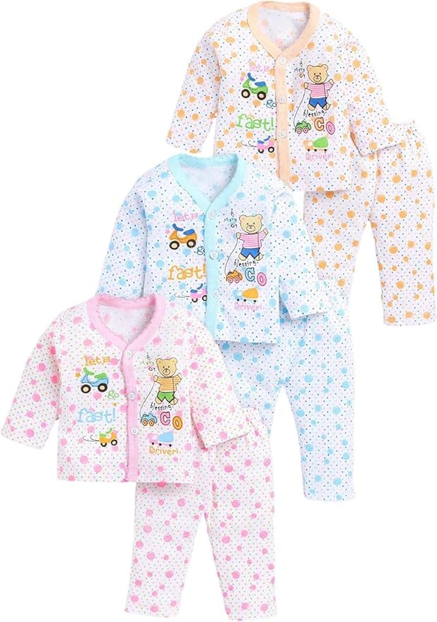 MUSTOVY Baby's Boy's Girl's 100% Cotton Vests, Jhabla T-Shirt with Pyjama Pant Dress Set of 3 Full Sleeves Infant Toddler New Born Baby Clothes