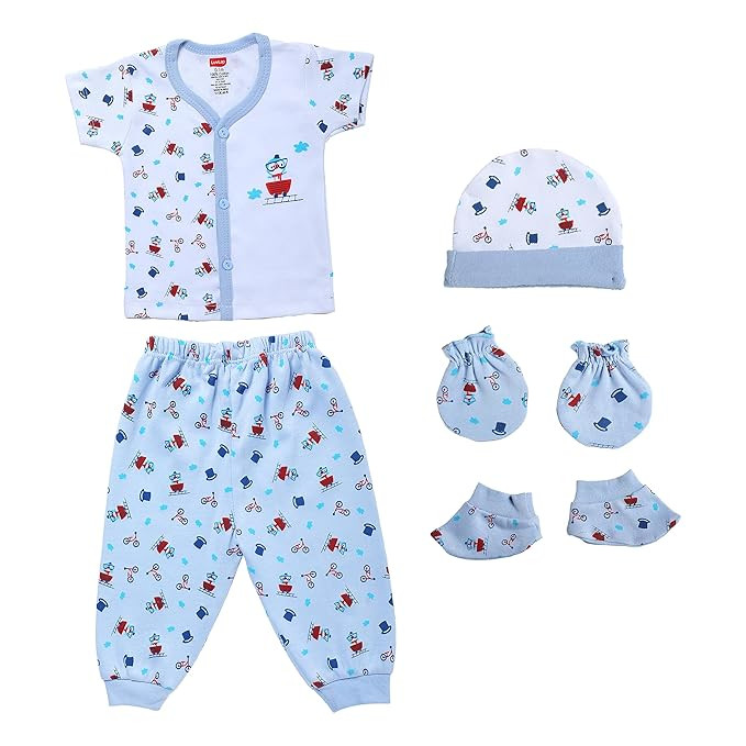 LuvLap Newborn Baby Cotton Gift Set Of 5 Items, Open Half Sleeves Jhabla Vest- Tshirt, Pyjama, Cap, Mittens & Socks, Baby Clothes Set 0-3 Months