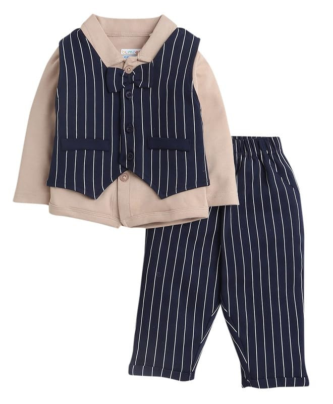 BUMZEE Beige & Navy Boys Full Sleeves Shirt Waistcoat & Pant Set With Applique Bow
