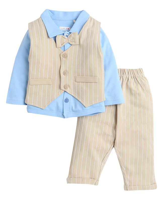 BUMZEE Beige & Sky Blue Boys Full Sleeves Shirt Waistcoat & Pant Set With Applique Bow