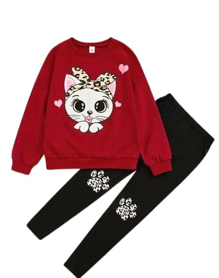 CRAZYON Toddler Girls Cat Print Long Sleeve Sweater Top and Pant Set Pink,Grey,Red