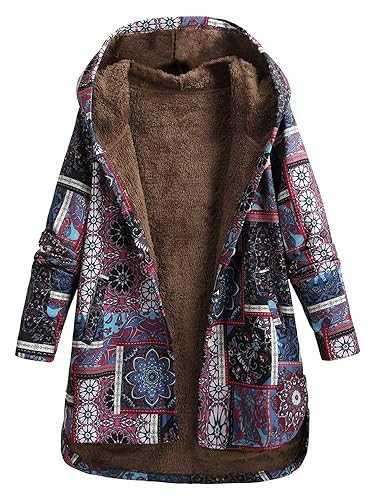 Women Vintage Loose Hooded Coat Floral Printed Fleeces Lining Buttoned Plus Size Winter Warm Parka Casual Long Coat Outwear
